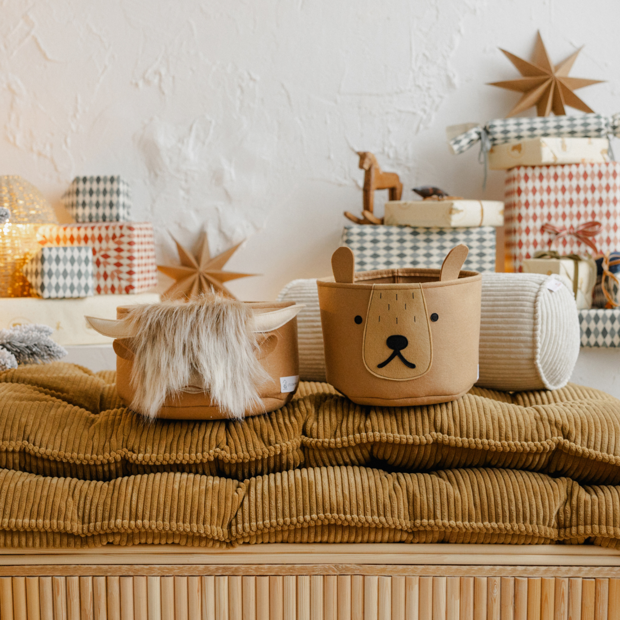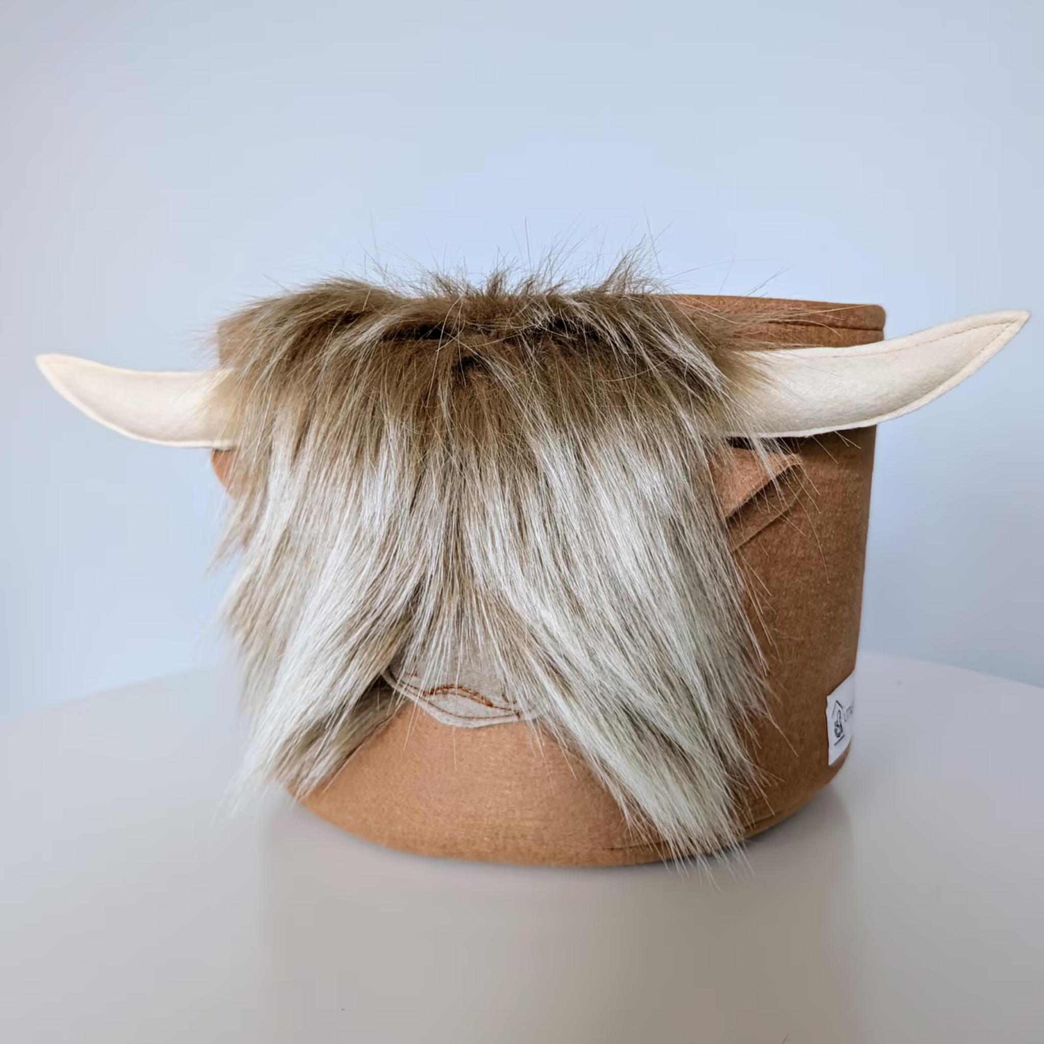 Bring a touch of the Scottish Highlands into your home with this handmade felt Highland Cow toy storage basket. Inspired by the beauty of our wonderful world and fantastic nature, this friendly cow adds charm, warmth, and playful character to any room. Take a little piece of nature home with you.